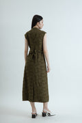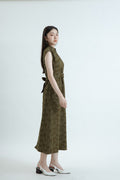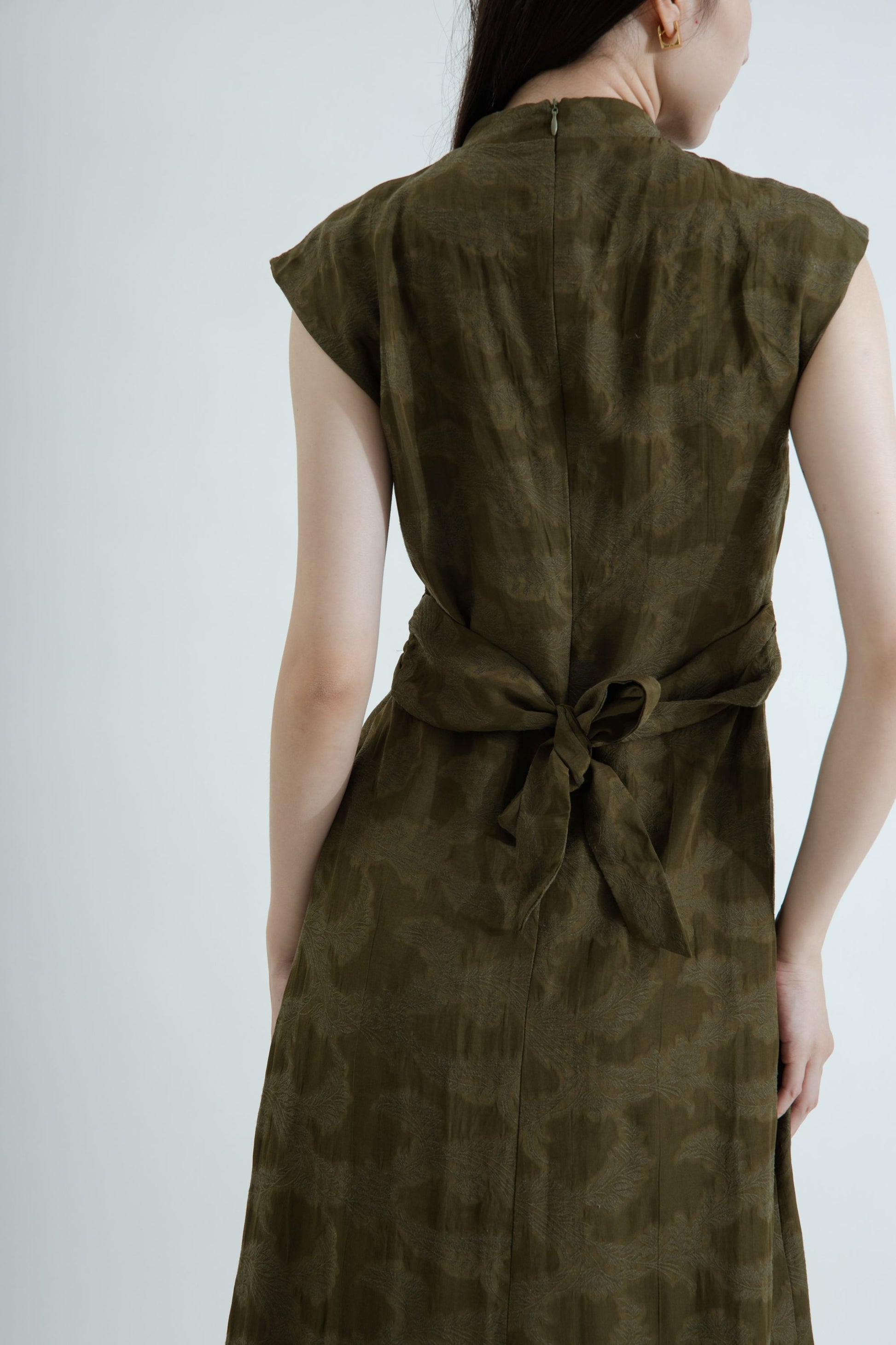 A modern cheongsam-inspired dress crafted from a 50% Rayon, 30% Tencel, 20% Linen blend. Designed with a mandarin collar, keyhole neckline, and waist tie for a softly defined silhouette. The tonal jacquard texture and fluid drape bring understated charm and effortless sophistication.